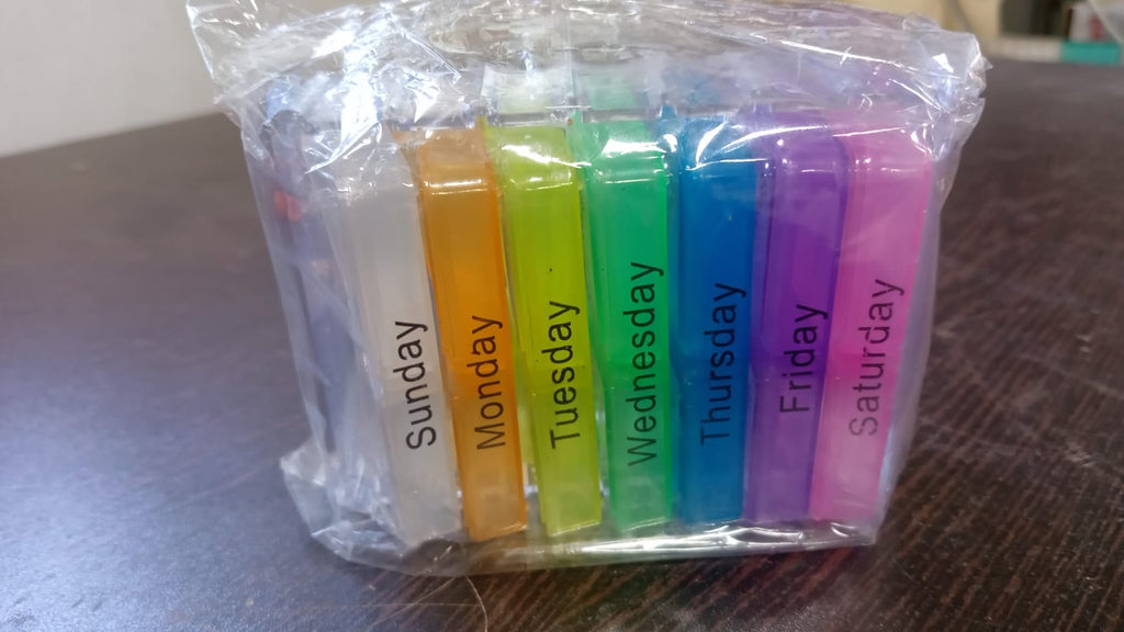 • Weekly pill box: 7 days pill organiser 4 times a day, clearly marked on the eyelids indicating the days of the week.